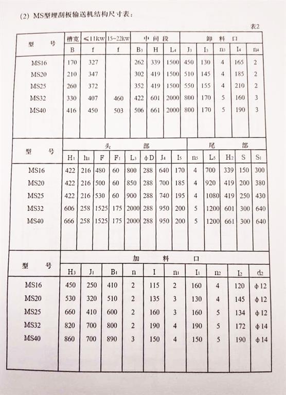 MS型埋刮板輸送機結(jié)構尺寸表: